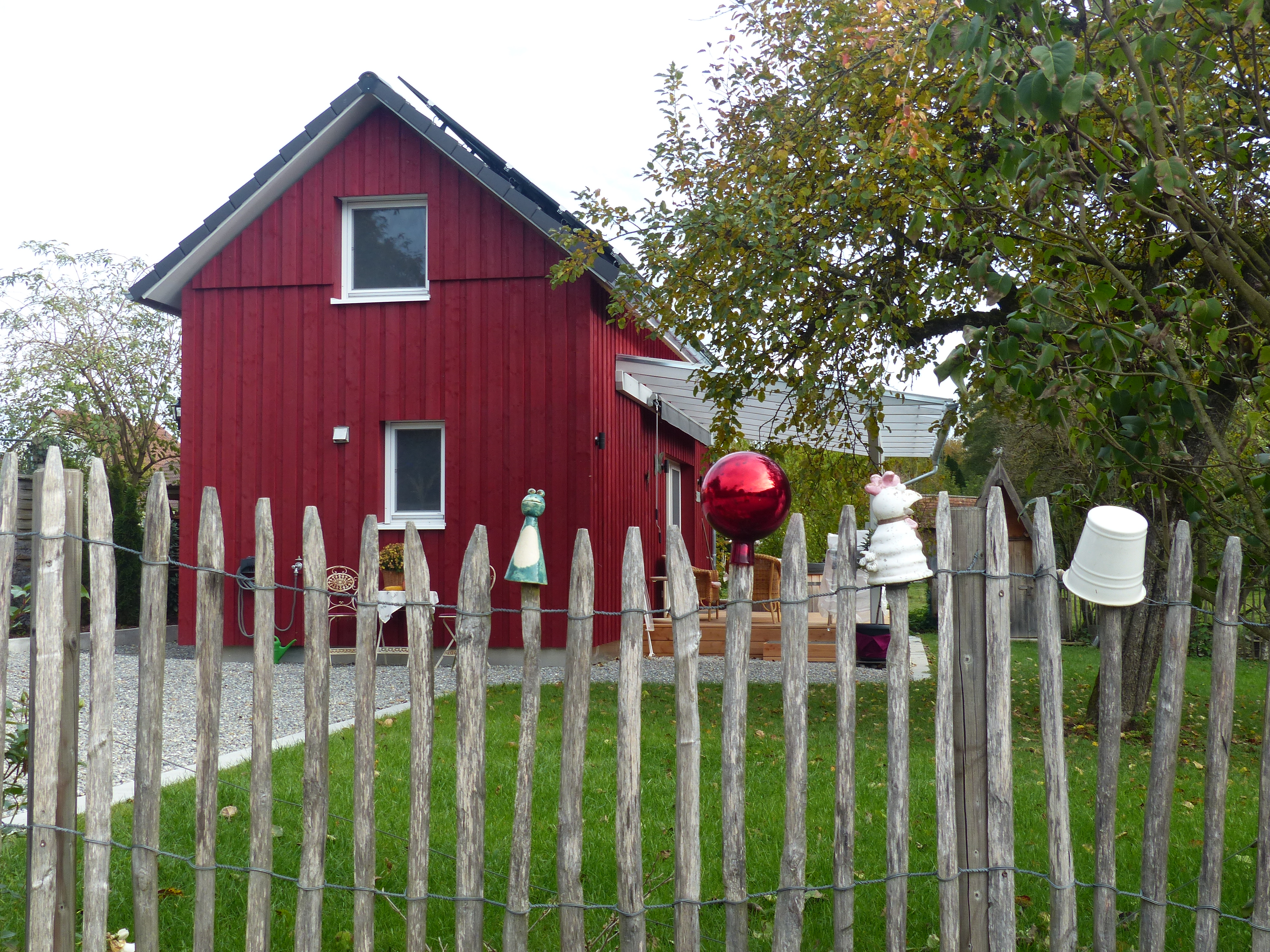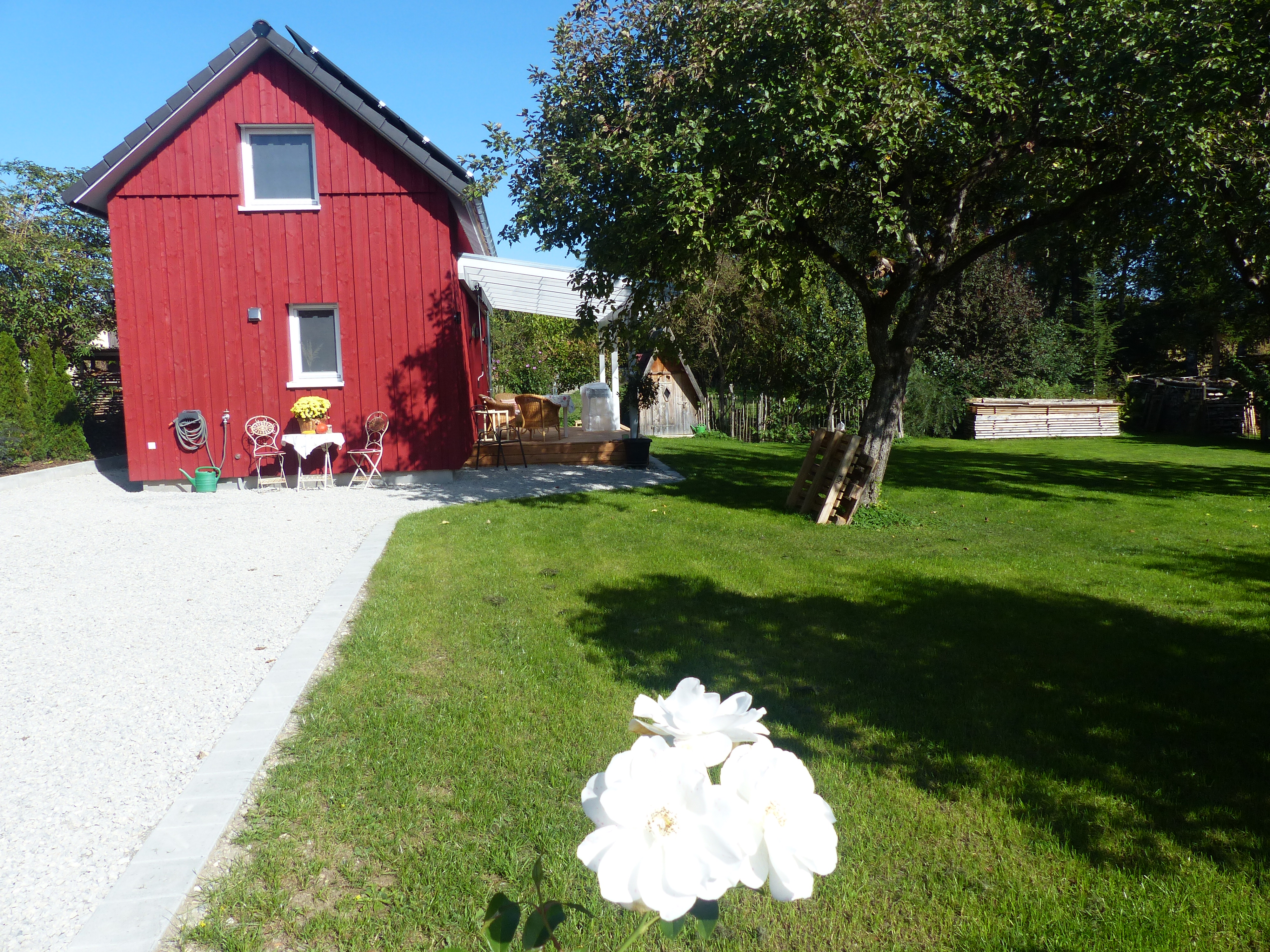 Das Häuschen verfügt über eine große, überdachte Holzterrasse wo Sie einen schönen Blick über das eingezäunte Grundstück haben. Hier können Sie mit einem ausgiebigen Frühstück den Tag beginnen, mittags unter den Apfelbäumen die Seele baumeln lassen und abends am Elektrogrill gemütlich zusammensitzen, oder auch im überdachten und beheizten Whirlpool mit romantischen Lichtern und einem Glas Sekt den Abend ausklingen lassen. Auf Wunsch kann auch am offenen Feuer am Teich gegrillt werden, dort tummeln sich auch unsere drei Laufenten und drei Zwergseidenhühner, die gerne zur Unterhaltung beitragen.