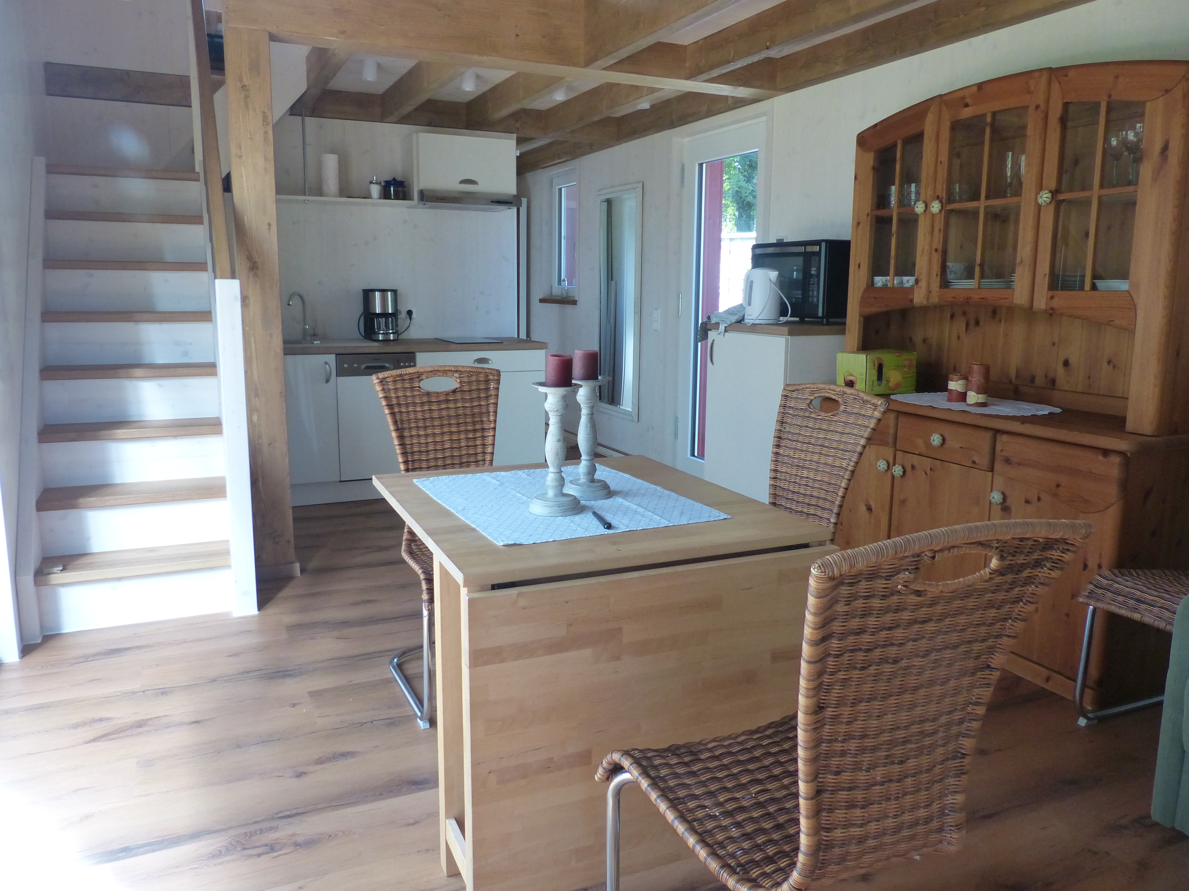 Unser Ferienhaus besteht aus einem offenen Ess- Wohnzimmerbereich, mit Dauerschlafsofa, Smart TV, Esszimmertisch und vier Stühlen, sowie einer kleinen Küche mit einer Ausstattung für den täglichen Gebrauch.